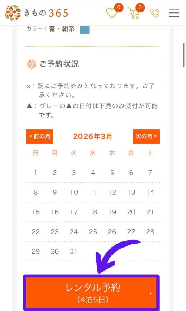 私の予約した着物も、3月分の予約を半年前行った時は3月4月ともに日数が選べる状態でしたが、2か月前に再度チェックしてみるとほとんど埋まっている状態でした。