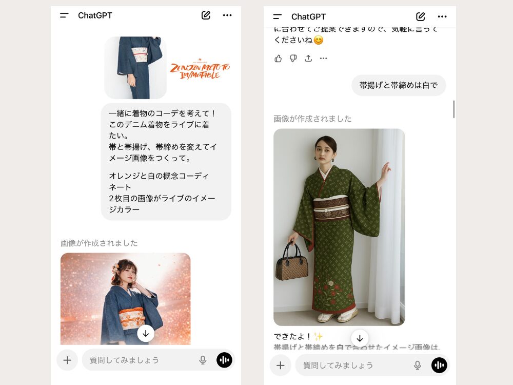 これから購入しようと思っている商品画像のスクリーンショットを添付して、「この着物に合う色味の帯は?」と聞けば、手持ちにないアイテムを組み合わせた全身イメージをその場で作ってもらえるため、大きな買い物も失敗することなく安心して楽しめます。