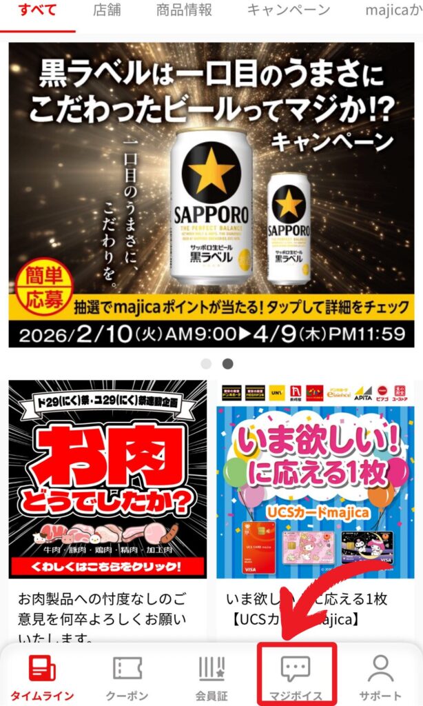 ①アプリ下のマジボイスをタップ