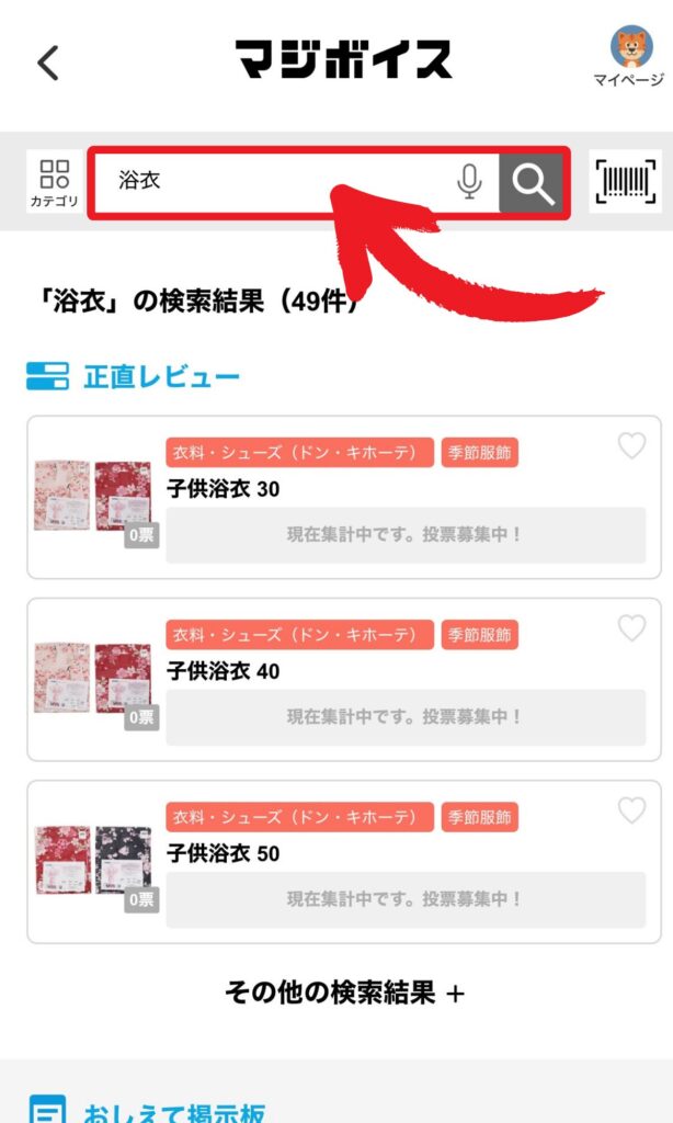 ②検索バーに探したいアイテムを入力して虫眼鏡マークをタップ