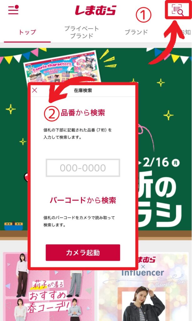 【品番がわかる場合】①アプリ右上の虫眼鏡マークをタップ②品番を入力して検索